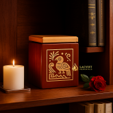 A square wooden cremation urn with a smooth natural finish and golden bird detail on the front. The simple cube design is both elegant and timeless. The secure top lid holds ashes safely, with a capacity of about 200 cubic inches, suitable for one adult.