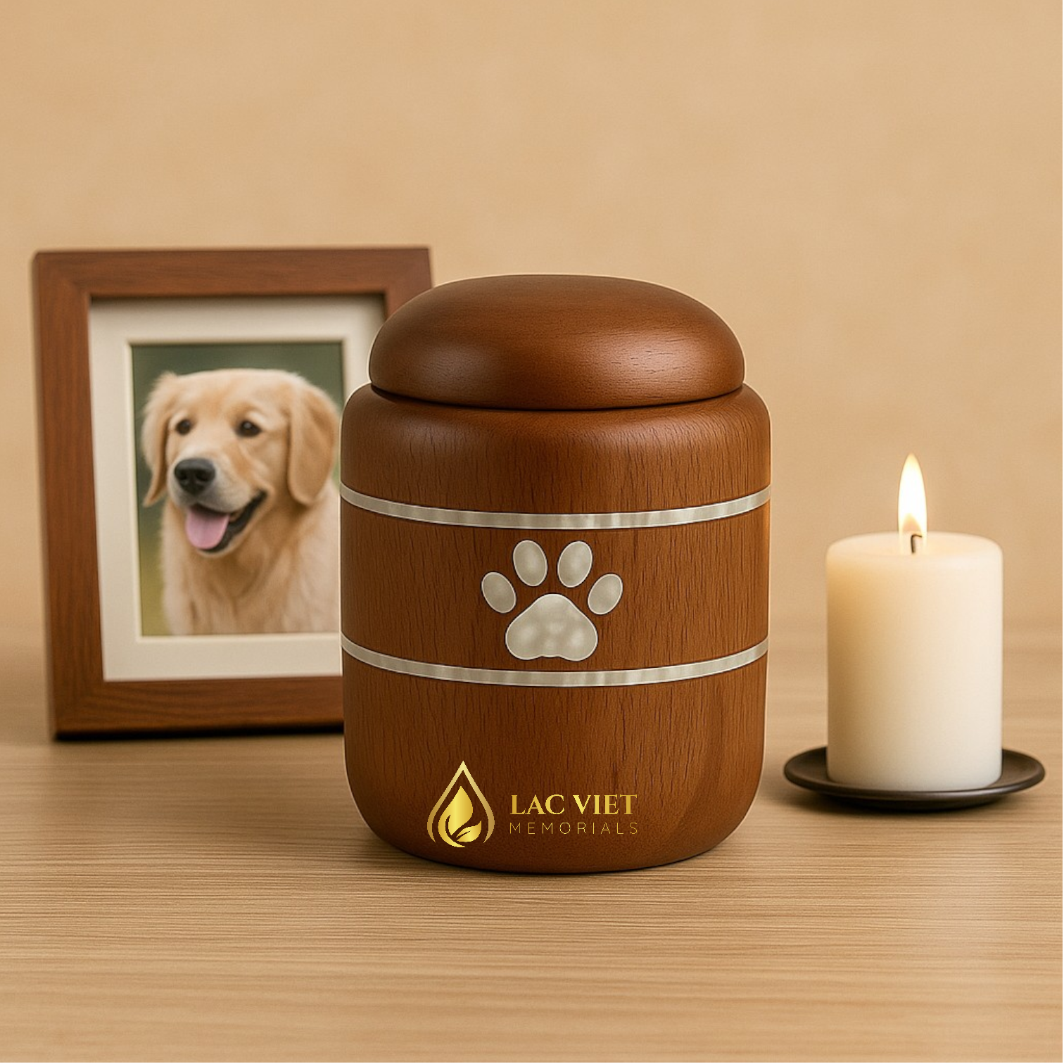 Made from beautiful solid wood, this urn features an intricate paw design. The natural warmth and strength of the wood provide a perfect, dignified tribute to a cherished pet.