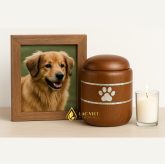 Made from beautiful solid wood, this urn features an intricate paw design. The natural warmth and strength of the wood provide a perfect, dignified tribute to a cherished pet.