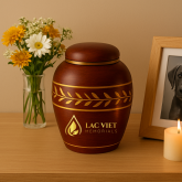 This pet cremation urn is crafted from wood with a smooth reddish-brown finish and a golden leaf pattern around the body. The classic rounded shape and secure lid keep your pet’s ashes safe, while its elegant design offers a warm and dignified tribute.