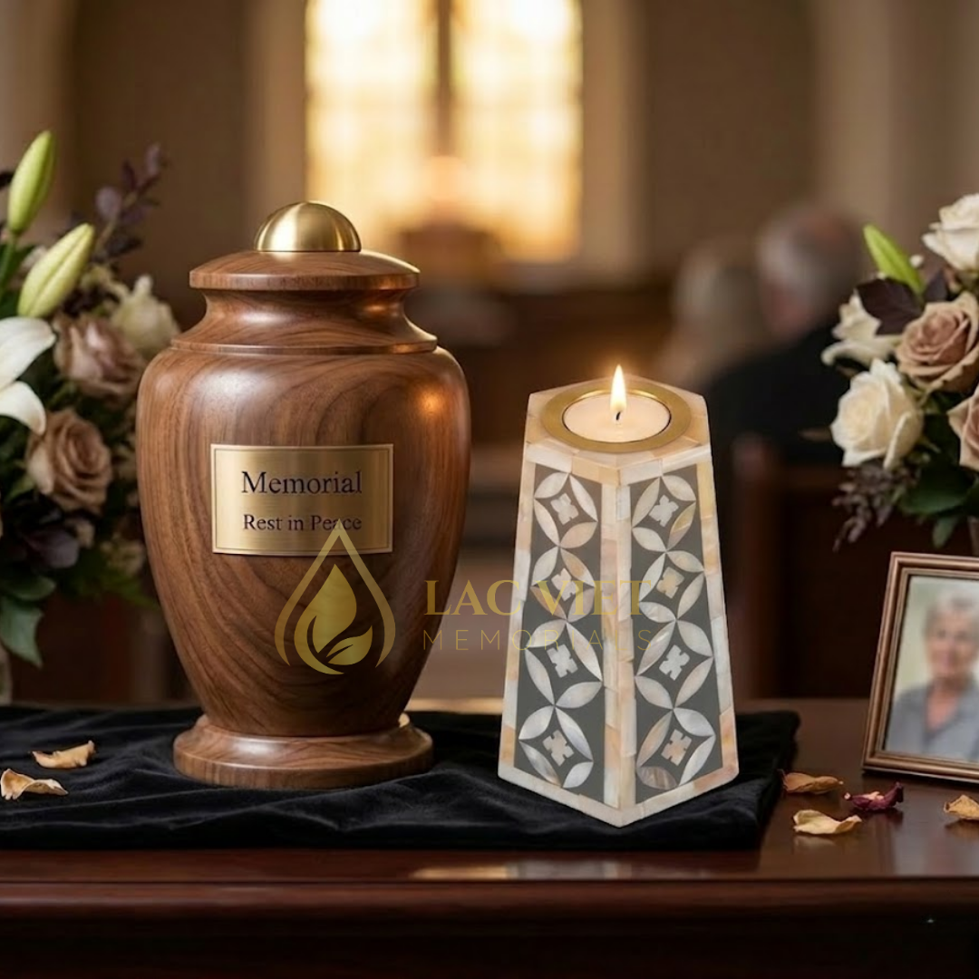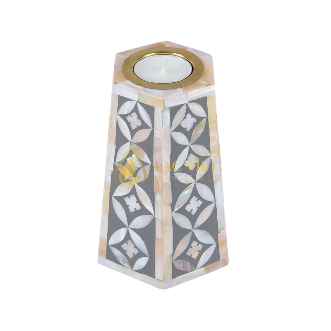 This elegant candle holder is crafted from durable MDF and beautifully finished with hand-inlaid mother of pearl, creating a soft, luminous effect when illuminated. The timeless design brings a sense of calm and reflection, making it ideal for funeral services, memorial ceremonies, and remembrance spaces.