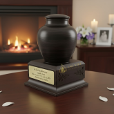 This elegant wooden display pedestal is thoughtfully crafted to showcase and elevate your loved one’s cremation urn. Made from high-quality solid wood with a smooth, dark finish, it adds warmth and dignity to any memorial setting. The engraved floral details and nameplate area allow for personalization, creating a meaningful and timeless tribute.
