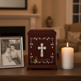 This beautiful wooden urn is handcrafted with care and features a stunning mother of pearl cross inlay, a symbol of faith, love, and peace. The smooth polished wood and delicate vine details give it an elegant, timeless look. A meaningful way to honor and remember your loved one.